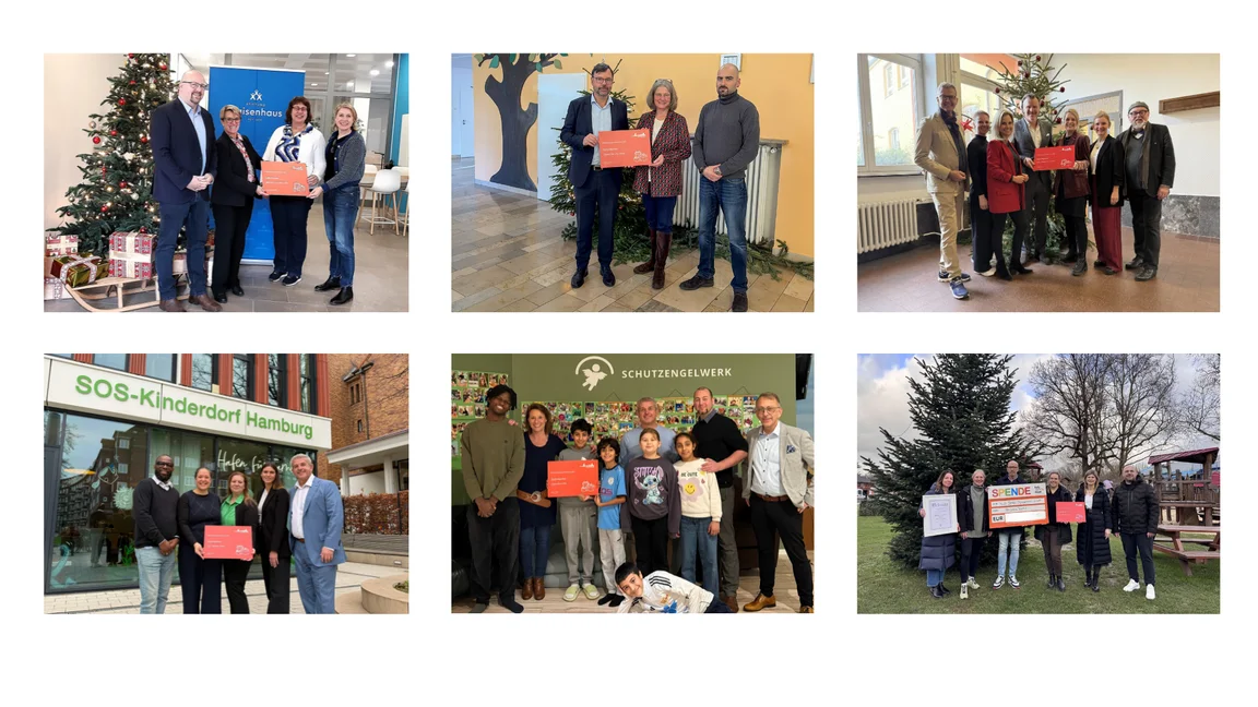 Zusätzlich zum Wunschbaum haben wir in diesem Jahr bewusst auf unsere traditionelle Weihnachtsfeier verzichtet und stattdessen ein Zeichen für gesellschaftliche Verantwortung gesetzt: An sechs Standorten in ganz Deutschland – Berlin, Dortmund, Düsseldorf, Frankfurt am Main, Hamburg und München – erhielten gemeinnützige Einrichtungen Spendenschecks, die gezielt Kindern zugutekommen, die ohne elterliche Fürsorge oder sozial benachteiligt aufwachsen.