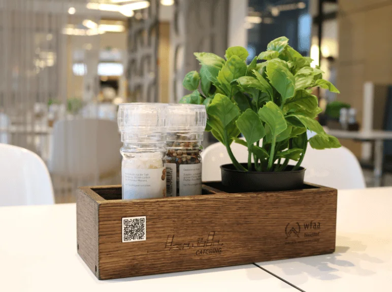 Der in die Kistchen eingelassene QR-Code, durch den die Tischgäste direkt in die Klüh Catering App gelangen, macht zusätzliche Tischaufsteller aus Pappe oder Kunststoff überflüssig, was uns insgesamt bei der Erreichung unserer Nachhaltigkeitsziele unterstützt und als zukünftig als Standard für alle Betriebe gilt.