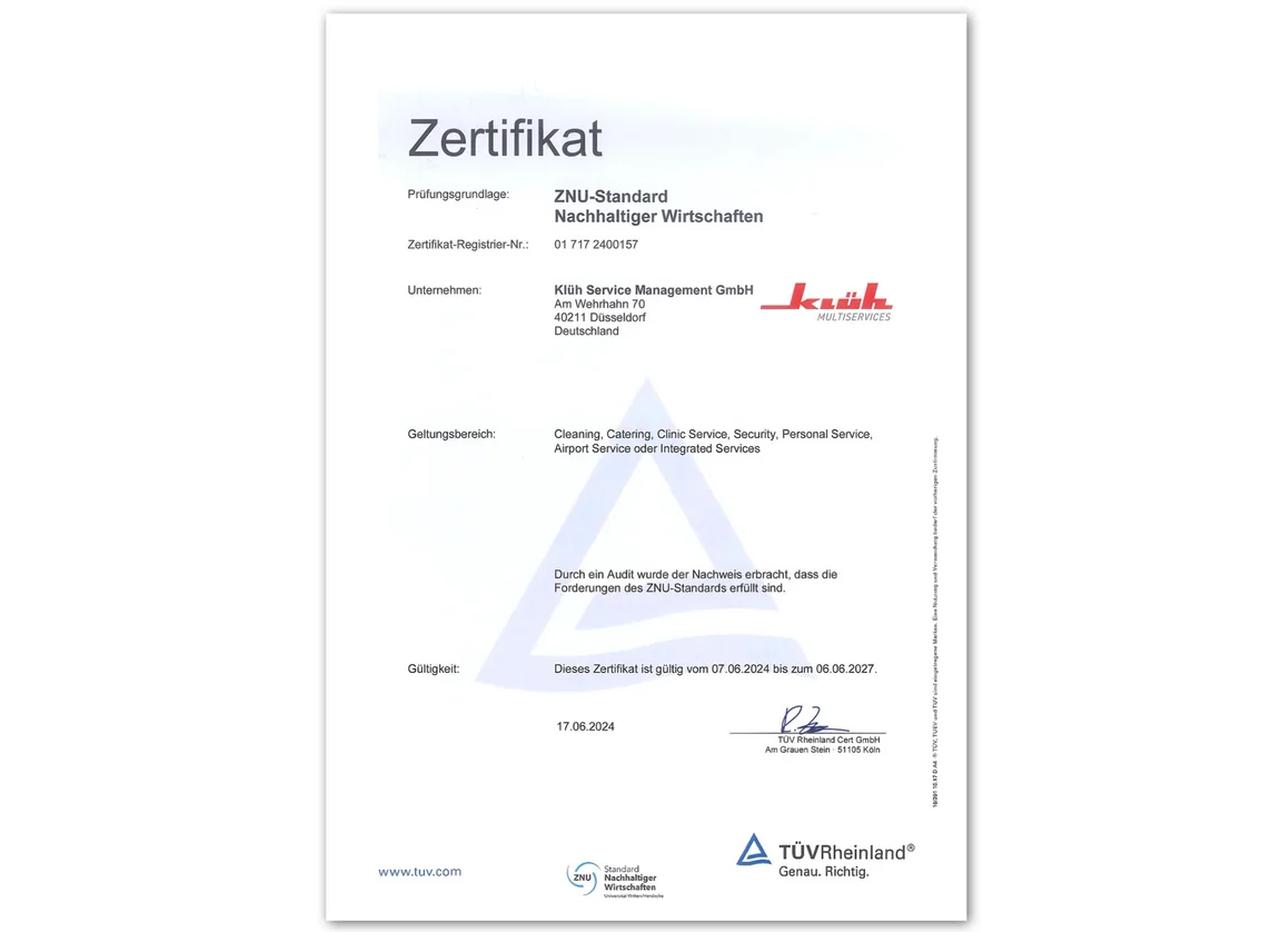 In June 2024, Klüh Catering – as a division of Klüh Multiservices – was certified for its successful sustainability commitment in accordance with the ‘ZNU Standard – driving sustainable change’ developed by the Centre for Sustainable Leadership (ZNU) at Witten/Herdecke University. This verifies the company’s performance in the areas of sustainable management and ecological, economic and social sustainability.